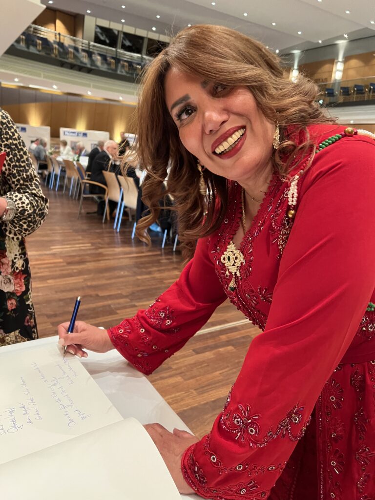 Anschließend lud die Stadt Weinheim die Würdenträger*innen und die vom Ministerium offiziell schriftlich eingeladenen Bürgermeister/Bürgermeisterinnen der Herkunftsorte der Geehrten und die entsprechenden Landräte/Landrätinnen oder Bundestagsabgeordnete, sowie die Angehörigen und die Ehrengäste der Geehrten zu einem Stehempfang ein. Einzelne Träger der Ehrenmedaille – wie auch Fouzia Hammoud – wurden dazu eingeladen, sich in das „Goldene Buch der Stadt Weinheim“ einzutragen.