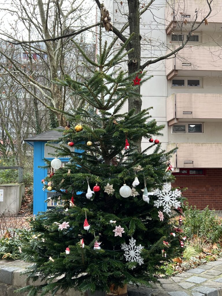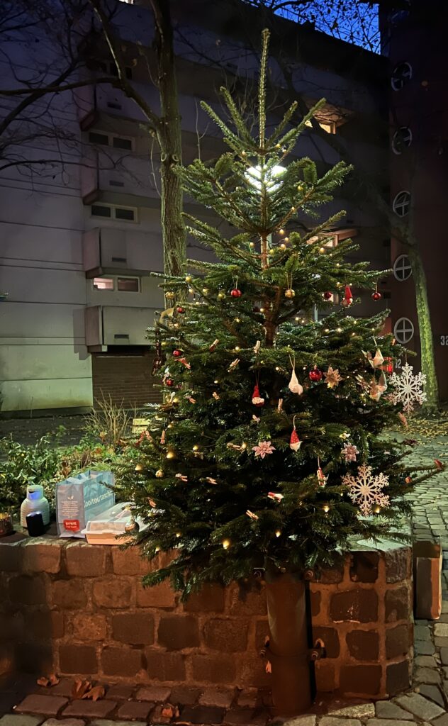 Neben dem Schlemmen und nachbarschaftlichen Plaudern wurde natürlich nebenher der Weihnachtsbaum geschmückt. Groß und Klein platzierten die mitgebrachten Sterne, Kugeln, Glöckchen, Weihnachtsmänner, Engelchen, Stiefelchen, Lichterketten und was sie sonst so noch für wichtig hielten, fachmännisch am – ständig immer schöner werdenden – Tannenbaum. Dann war das Werk vollbracht! Alle Augen strahlten. Das Gemeinschaftswerk war nicht nur gelungen, nein, jeder fand, dass es auch „toll“ geworden ist und dass es ein schöner Abend war!