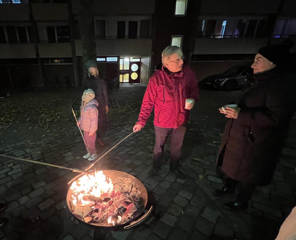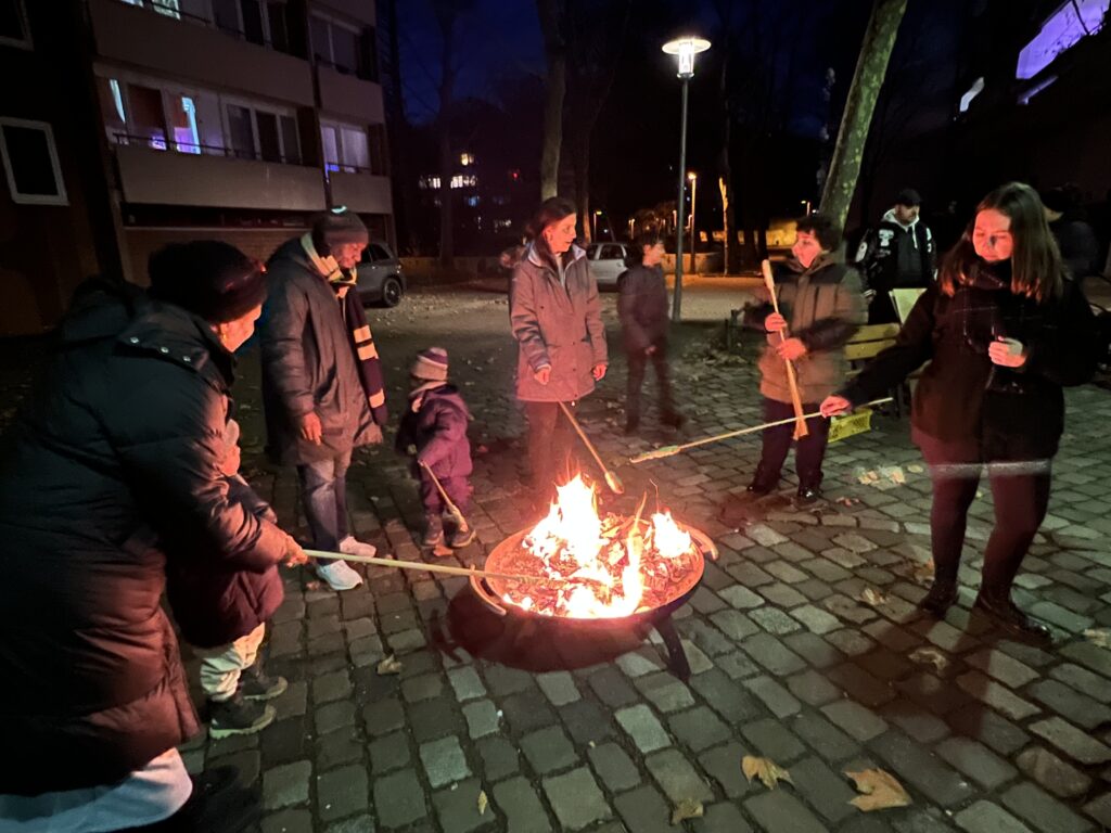 Viele waren den, an den meist begangenen Stellen im Herzogenried ausgehängten, Einladungen gefolgt und waren zum Bücherschrank gekommen. Jeder hatte etwas Selbstgemachtes mitgebracht. Da gab es heiße und kalte Getränke wie Kinderpunsch, Glühwein, Tee, Kaffee, Saft oder Limo. Es gab selbstgebackene Plätzchen, Gebäck, Weihnachtsstollen und auch Salziges. Der Renner war natürlich das Stockbrot, das vom Atelier für Kunst und Natur vorbereitet worden war und am Feuerchen selbst geröstet werden konnte. Da schlugen nicht nur die Kinderherzen höher.