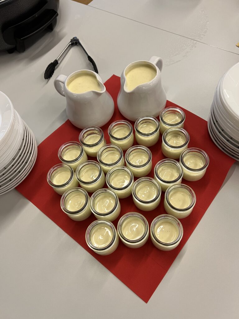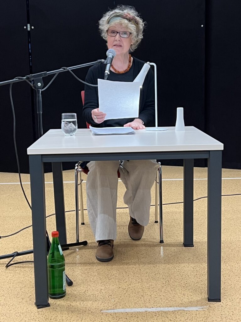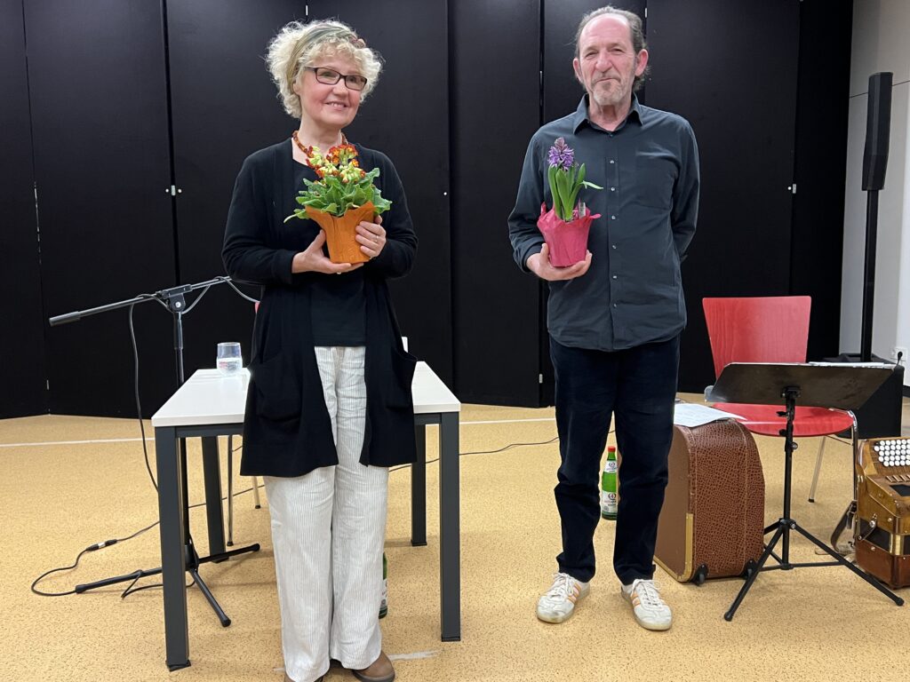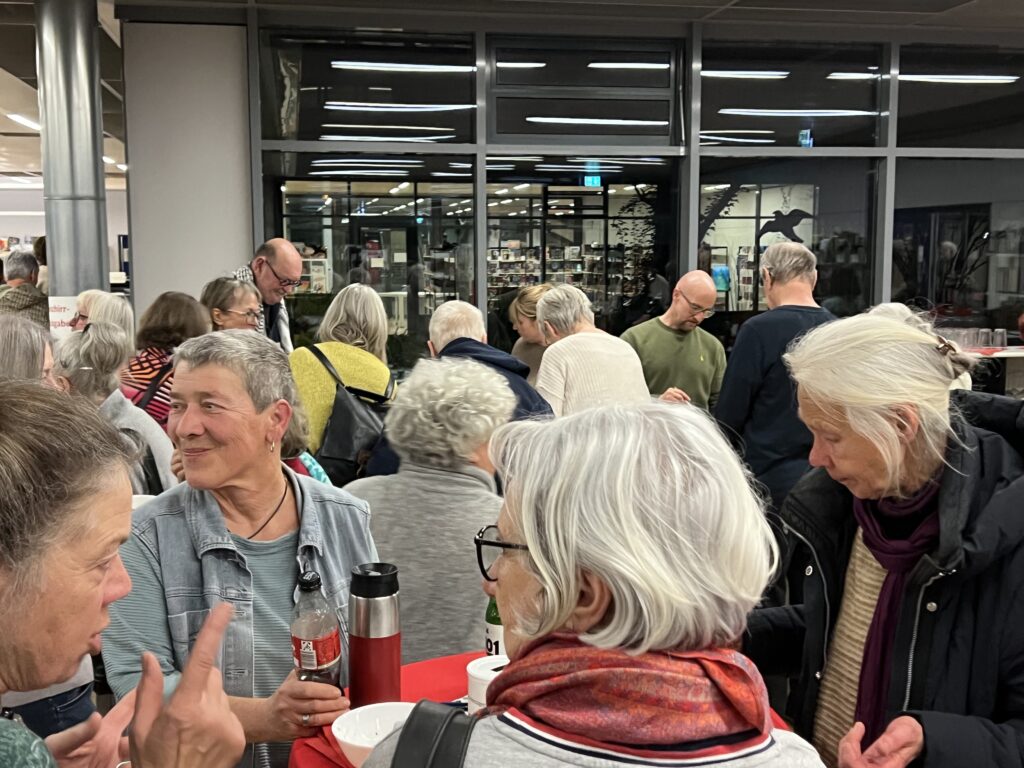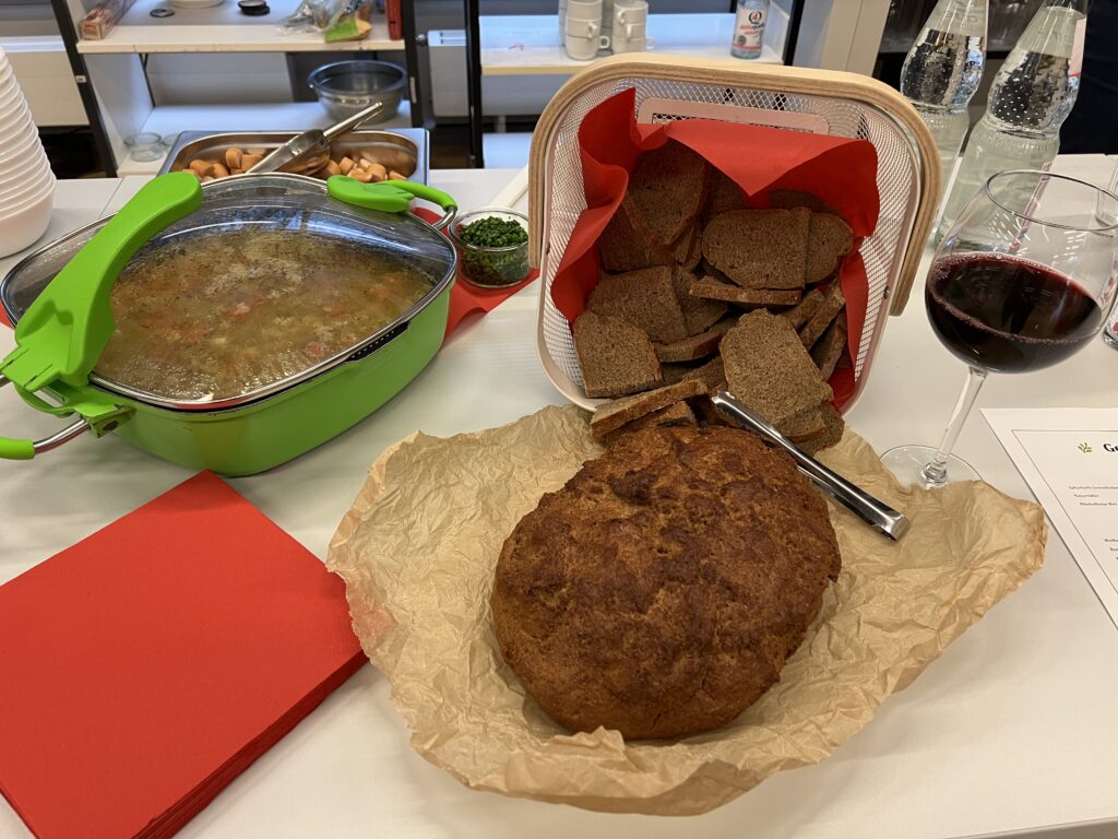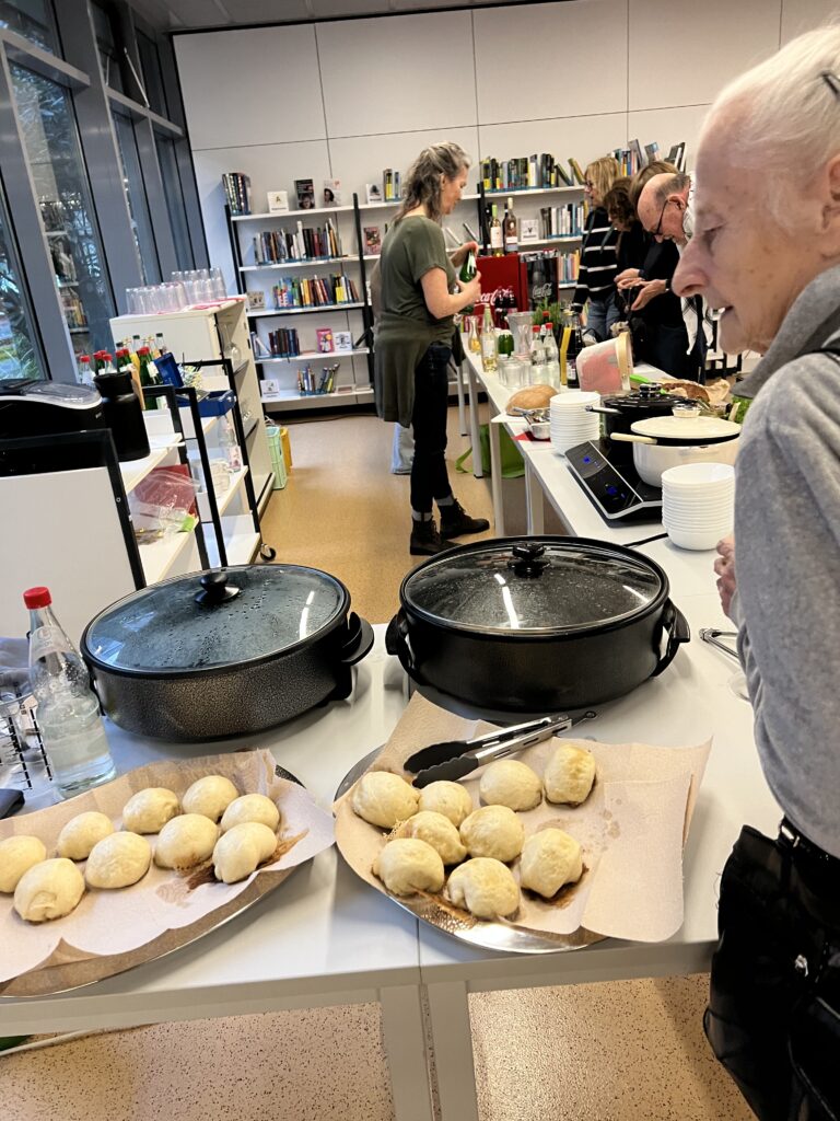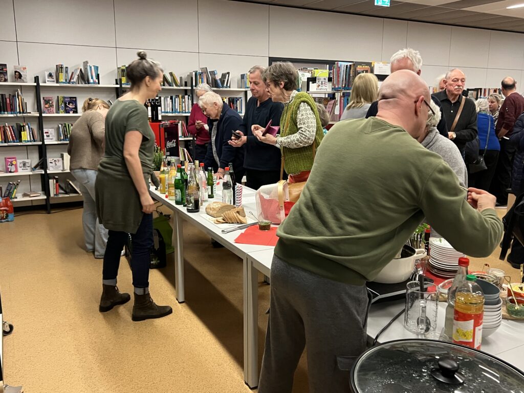 Zur Pause hatten die Bibliothekarinnen der Stadtbibliothek Herzogenried – wie schon so oft – wieder einmal (gemeinsam mit ihren Helfer*innen) gezaubert! Alle in ihrer Freizeit und völlig ehrenamtlich! Sie servierten köstliche Dampfnudeln mit Vanillesauce oder toll gewürzter Kartoffelsuppe (selbstverständlich auch vegan oder mit Beilagen). Dazu gab´s selbstgebackenes, knuspriges Brot und Getränke aller Art sowie leckere selbstgemixte Cocktails mit und ohne Alkohol. Was das Herz halt so begehrt. Nach diesem Genuss eine tolle Basis für das zweite künstlerische Erlebnis des Abends.