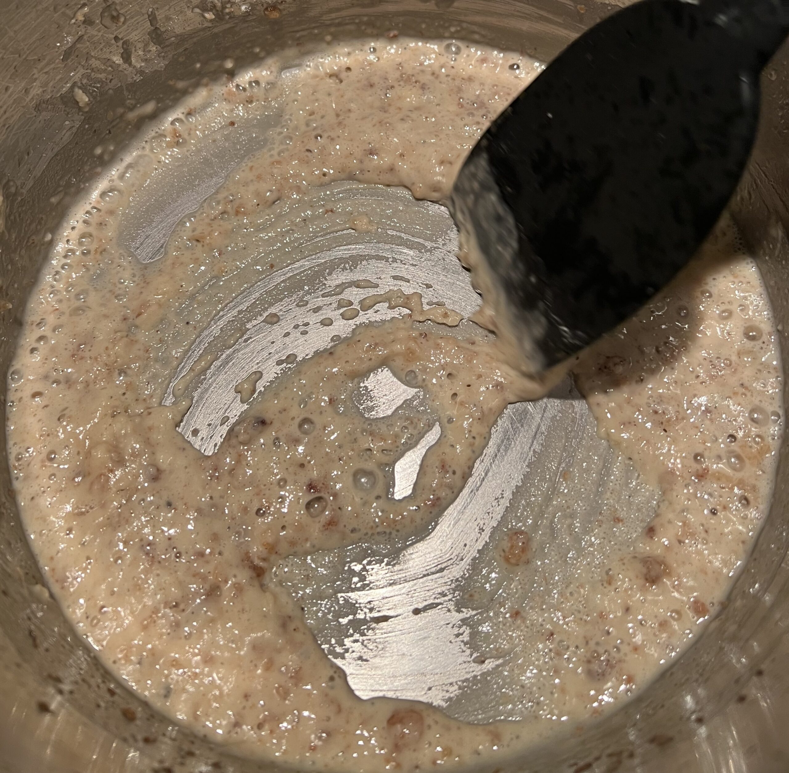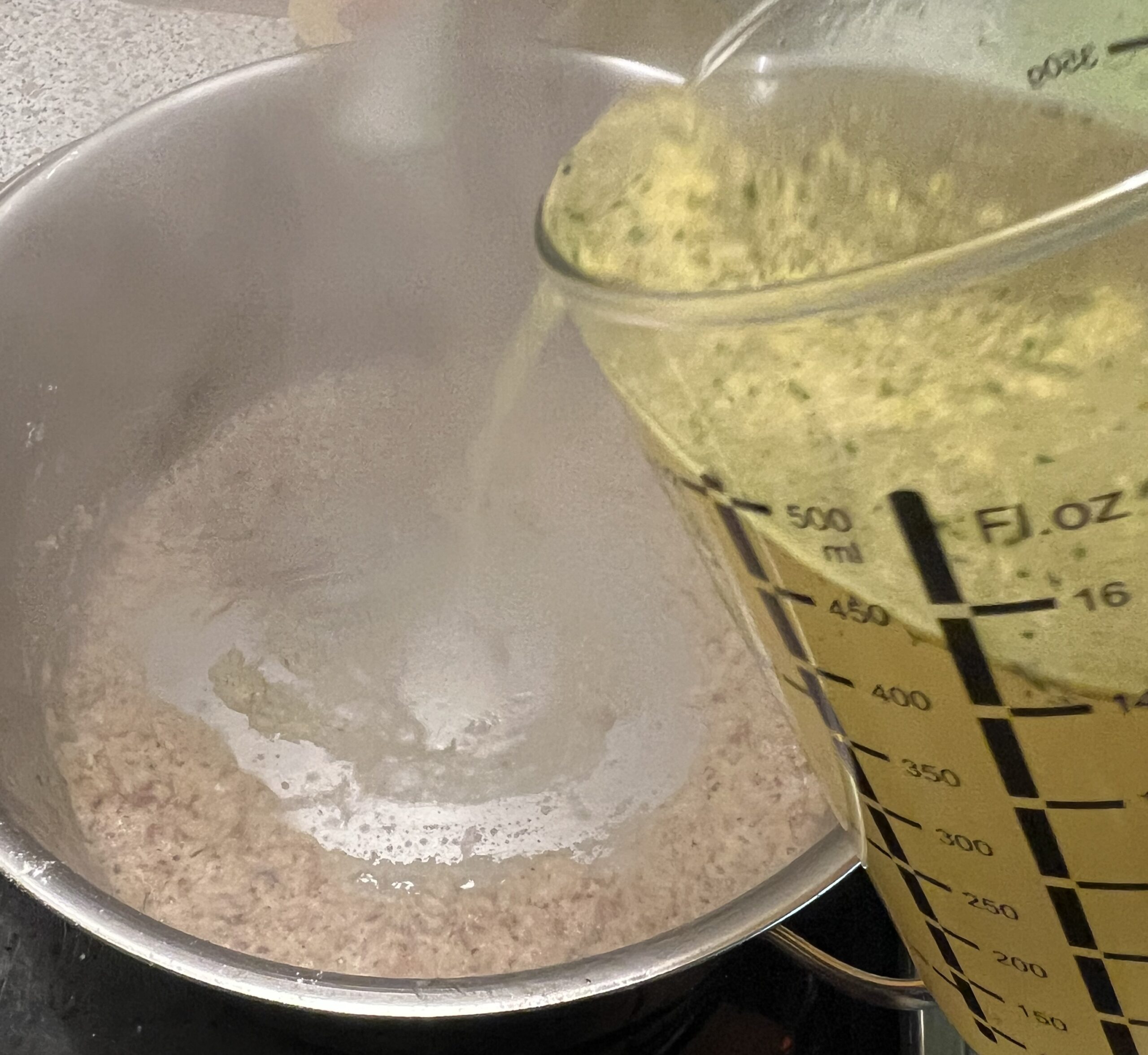 Unter weiterem Rühren mit der Fleischbrühe ablöschen bis eine dickflüssige Sauce entsteht. Darauf achten, dass sich keine Klümpchen bilden (gegebenenfalls mit Stabmixer auflösen).