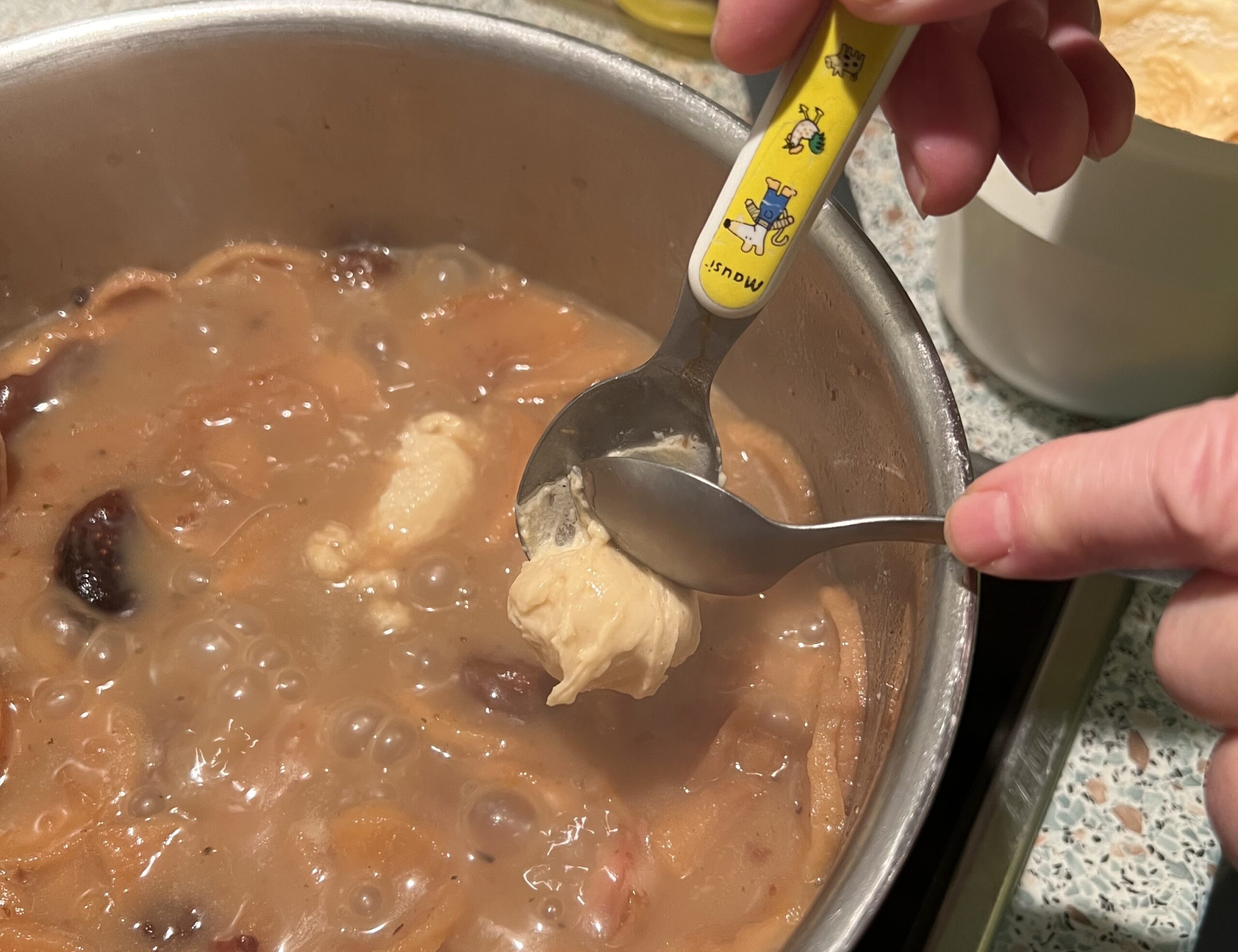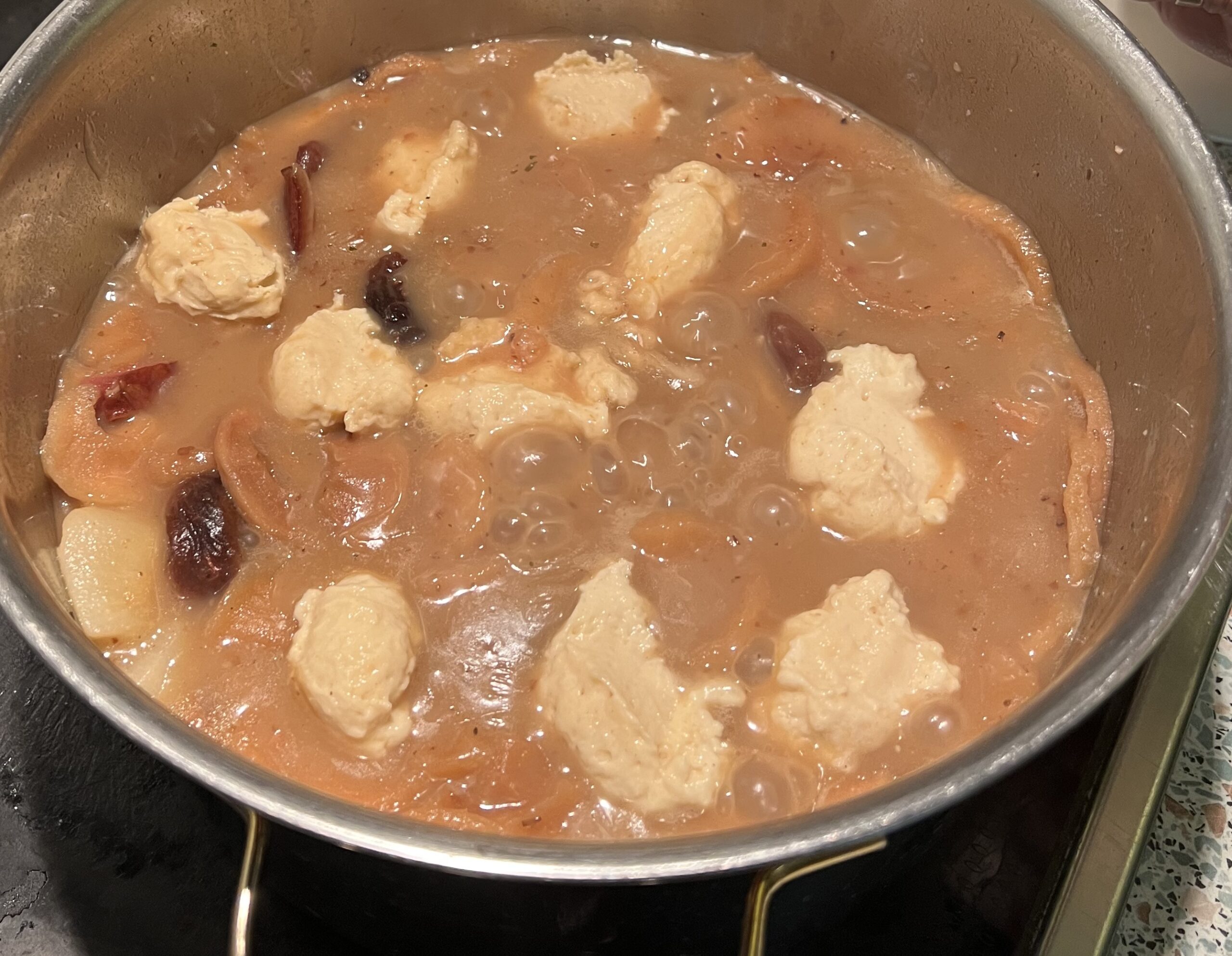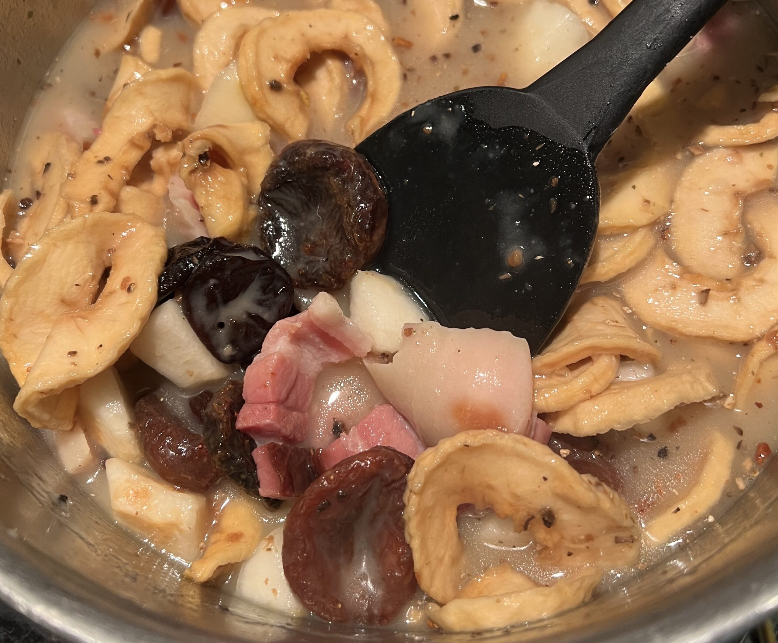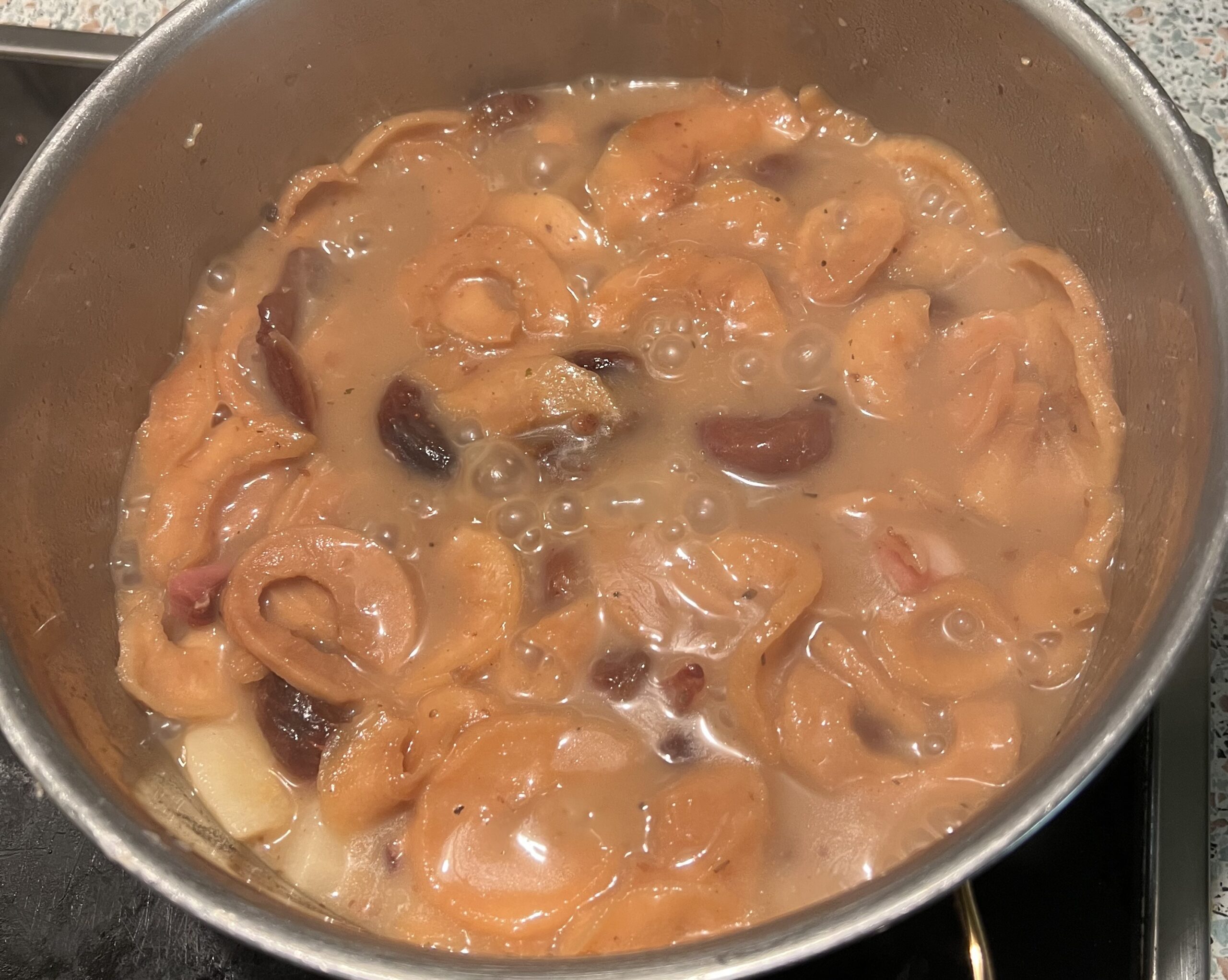 - Zusammen mit dem Dörrobst, den Rosinen (Sultaninen) und den in einer Kaffeemühle pulverisierten, gemischten Trockenpilzen in die Sauce geben.