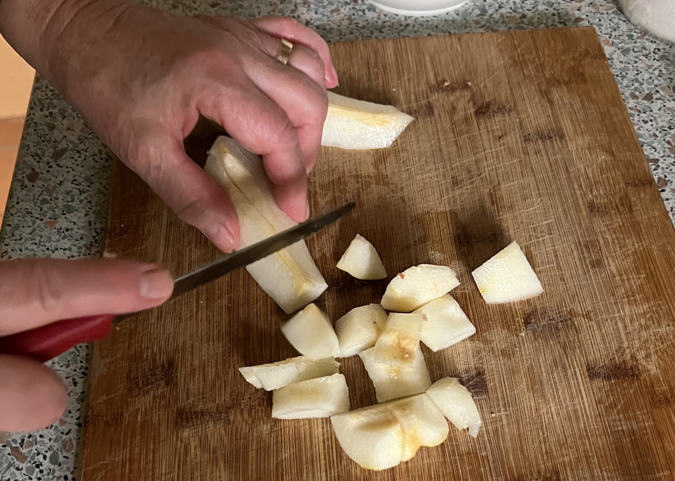 Die Birne schälen, das Kerngehäuse entfernen und in zuckerwürfelgroße Stücke schneiden. Alternativ eingekochte Birnen verwenden.
