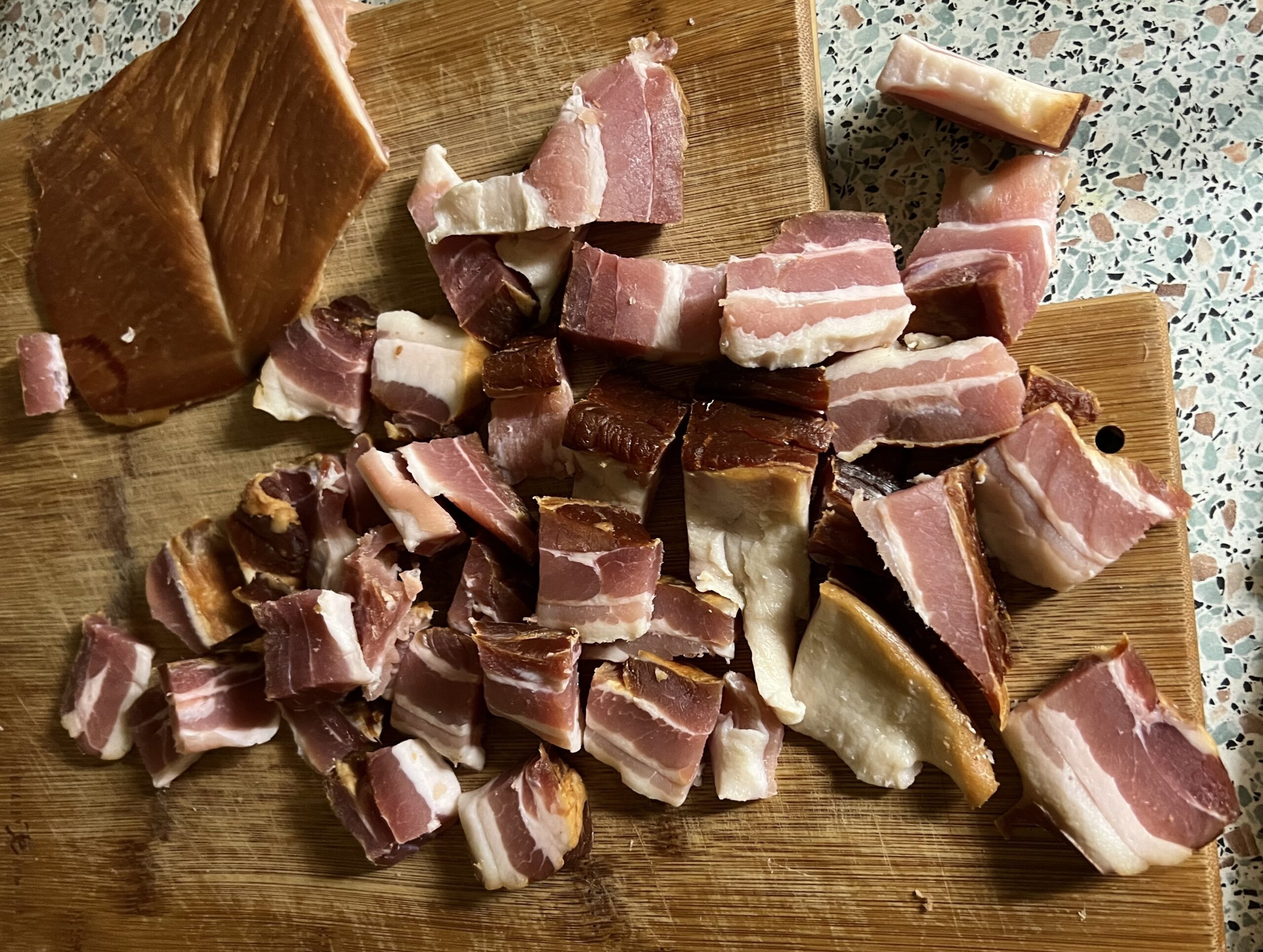 Vom Dörrfleisch (Rauchfleisch) die Schwarte entfernen. Dann zuerst 1 ½ Zentimeter breite Scheiben schneiden und diese dann in 1 ½ Zentimeter breite Streifen (oder in Würfel) teilen.