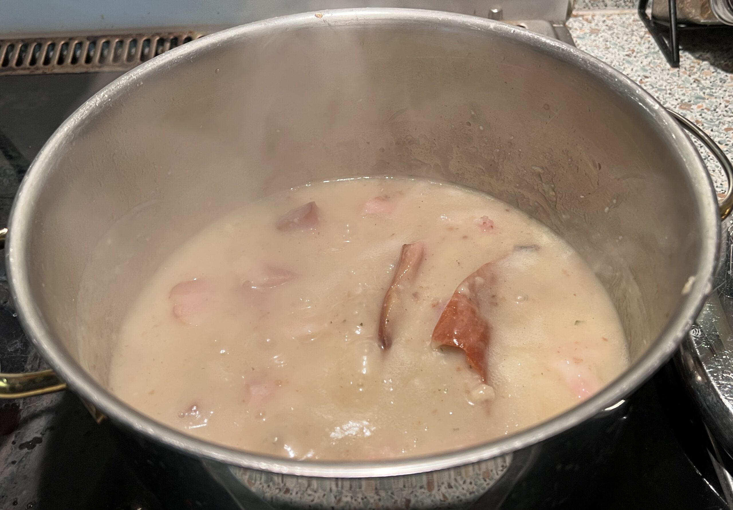 - Schwarte, Dörrfleisch, Zimt, Nelken, Essig und Zucker in die Sauce geben. So viel Wasser zugeben, dass alles gerade bedeckt ist und leicht für 20 Minuten durchköcheln lassen.