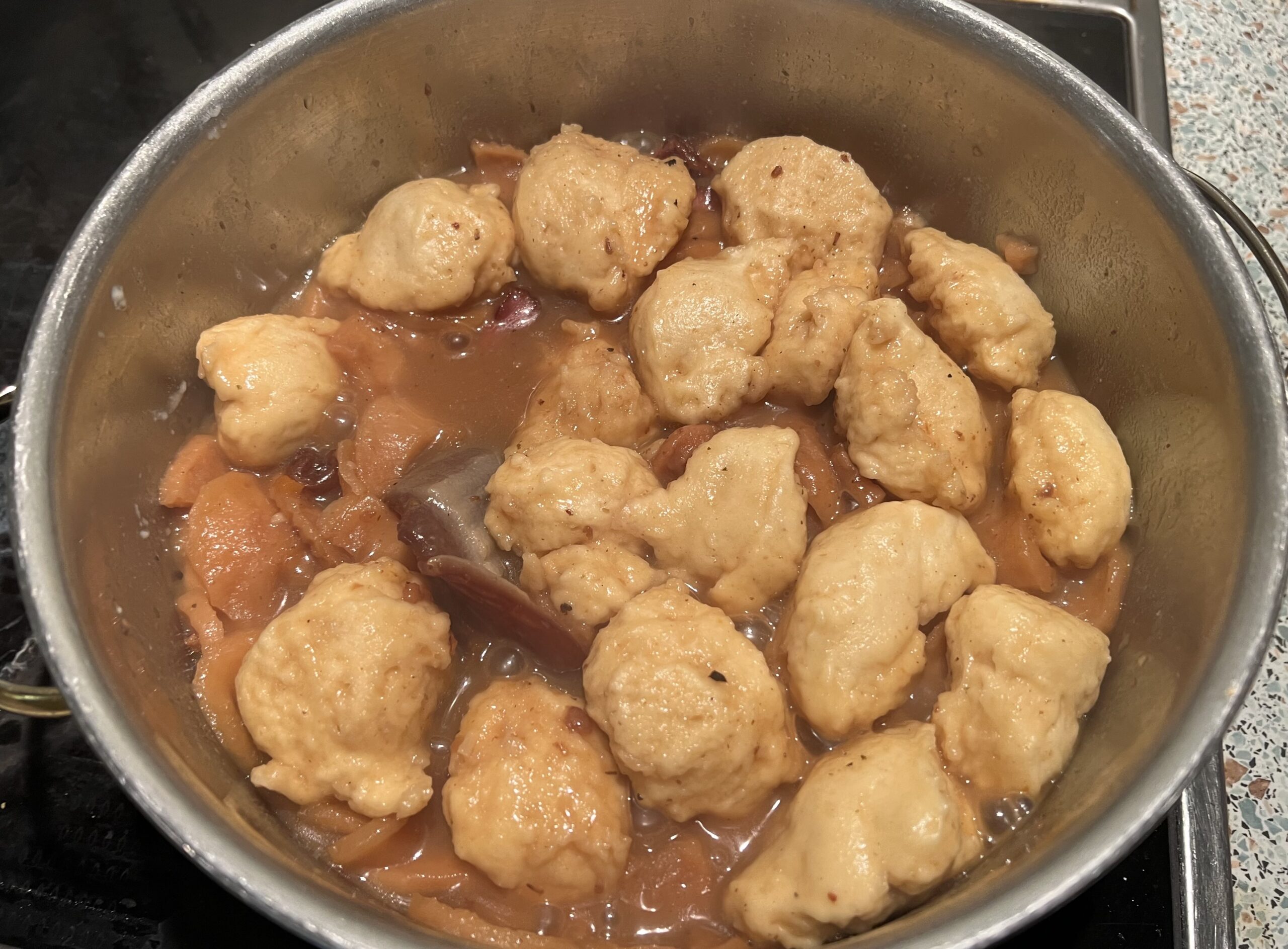 Parallel 2 Eier trennen und die Eiweiße mit 2 Esslöffeln Wasser steif schlagen. Dann die Eigelbe, das Mehl und das Backpulver unterrühren, bis ein weicher Teig entsteht. Etwa 10 Minuten quellen lassen und mit Salz und Muskat abschmecken. Mit zwei Teelöffeln daraus etwa 18-20 kleine Klöße formen und für die letzten 15 Minuten der Kochzeit der Sauce in dieser mitgaren lassen.
