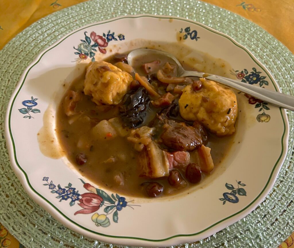 Zum Schluss die Schwarte und die Zimtstange herausnehmen und nochmal mit Essig und Zucker abschmecken. Nötigenfalls mit in kaltem Wasser aufgelöstem Stärkemehl nachdicken. Der Eintopf sollte gut gebunden und sämig sein. In einer Suppenschüssel servieren.