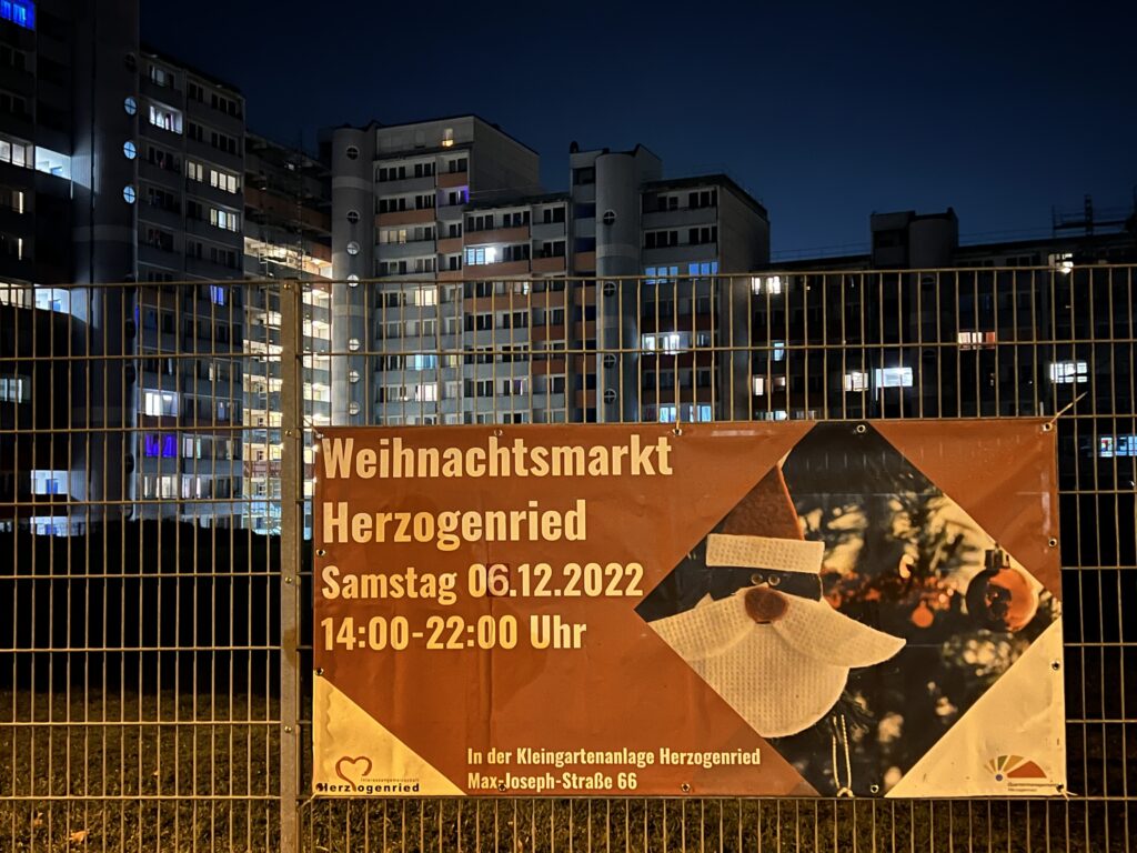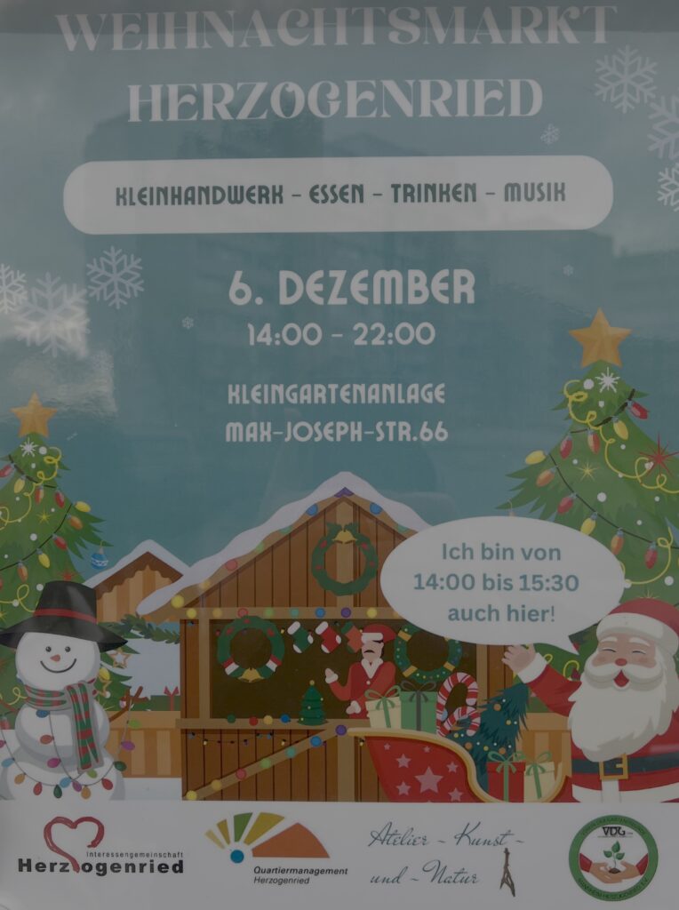 Die Interessengemeinschaft Herzogenried IGH, Der Verein der Gartenfreunde VDG, Das Quartiermanagement Herzogenried und das Atelier für Kunst und Natur hatten wieder zu ihrem traditionellen, jährlichen Weihnachtsmarkt rund um die Gartenklause geladen. Viele Bewohner des Herzogenried (und Außerhalb) nutzten das Angebot, um sich mit Nachbarn, Freunden und Bekannten in geselliger Runde zu treffen, sich zu stärken und gemeinsam zu plaudern. Übrigens: Der Nikolaus kam nicht, wie üblich, mit Knecht Ruprecht angereist, sondern ins Herzogenried ausnamsweise mit seinem Engel.
