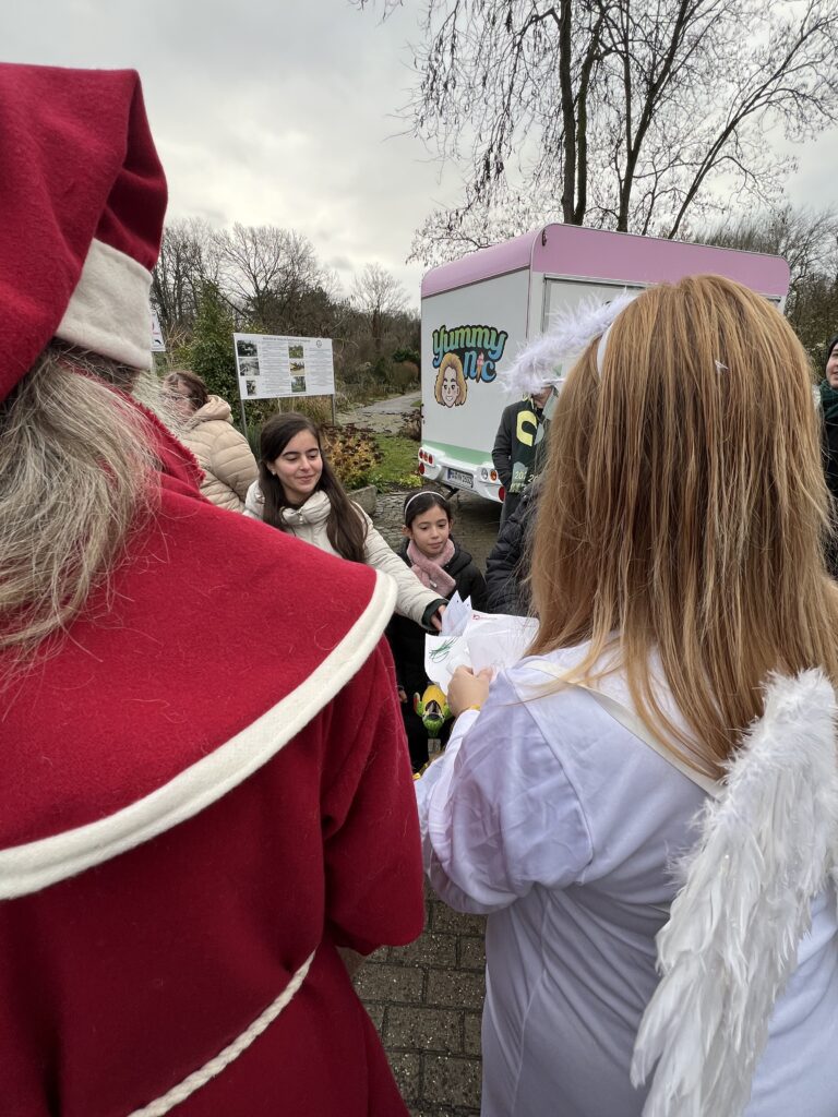 Zuerst besuchte der Nikolaus in der Gartenklause die dort schon sehnsüchtig wartenden Kinder und verteilte seine Geschenke. Aber er wollte von ihnen auch wissen, wie der neue Schlitten vom Nikolaus aussehen soll. Ist er vielleicht rot mit goldenen Glöckchen, ziehen ihn Rentiere oder fliegt er sogar selbstständig mit Raketen durch den Sternenhimmel? Blinken an ihm bunte Lichter, ist Platz für ganz viele Geschenke, kann er singen? Der Fantasie waren keine Grenzen gesetzt. Bilder konnten zum Weihnachtsmarkt mitgebracht werden und gegen eine kleine Überraschung vom Nikolaus eingetauscht werden. Aber auch Gedichte konnten vorgetragen und Lieder vorgesungen werden. Danach stapfte der Nikolaus mit seinem Engel über den Weihnachtsmarkt, um auch dort die Kinder zu treffen und zu beschenken.